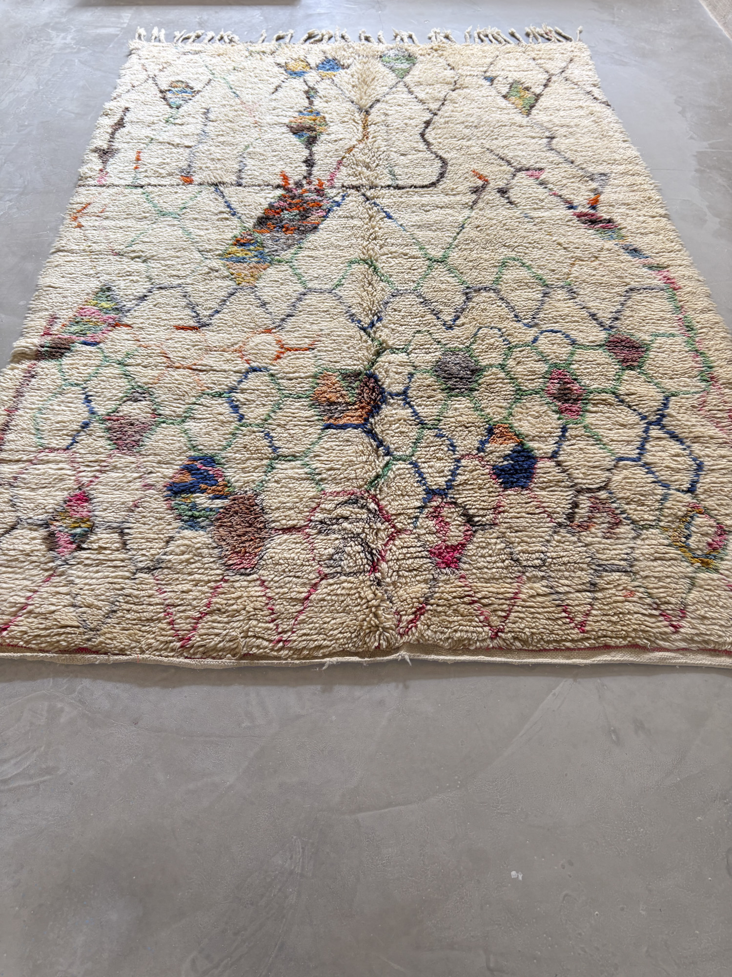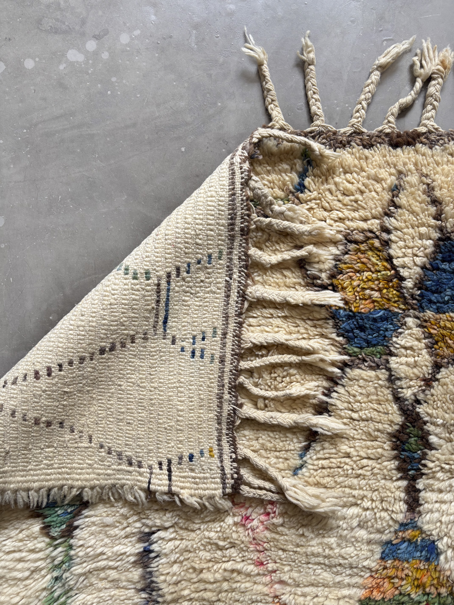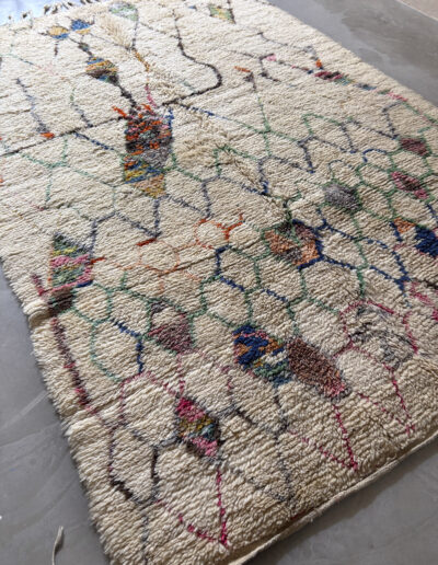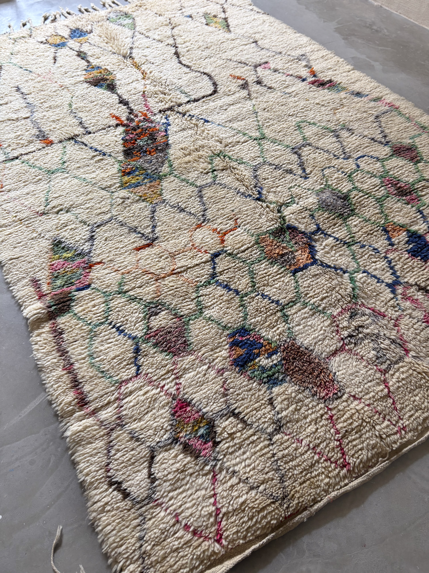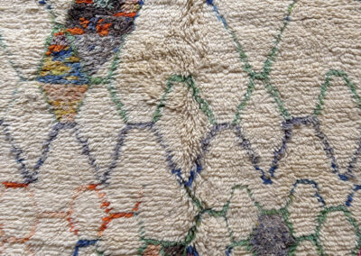 Esta alfombra está hecha a mano y es una pieza vintage, por lo que puede presentar irregularidades propias de su elaboración y del paso del tiempo. Las variaciones en el tejido, el grosor de la fibra o el color forman parte de su naturaleza artesanal y no deben considerarse defectos.