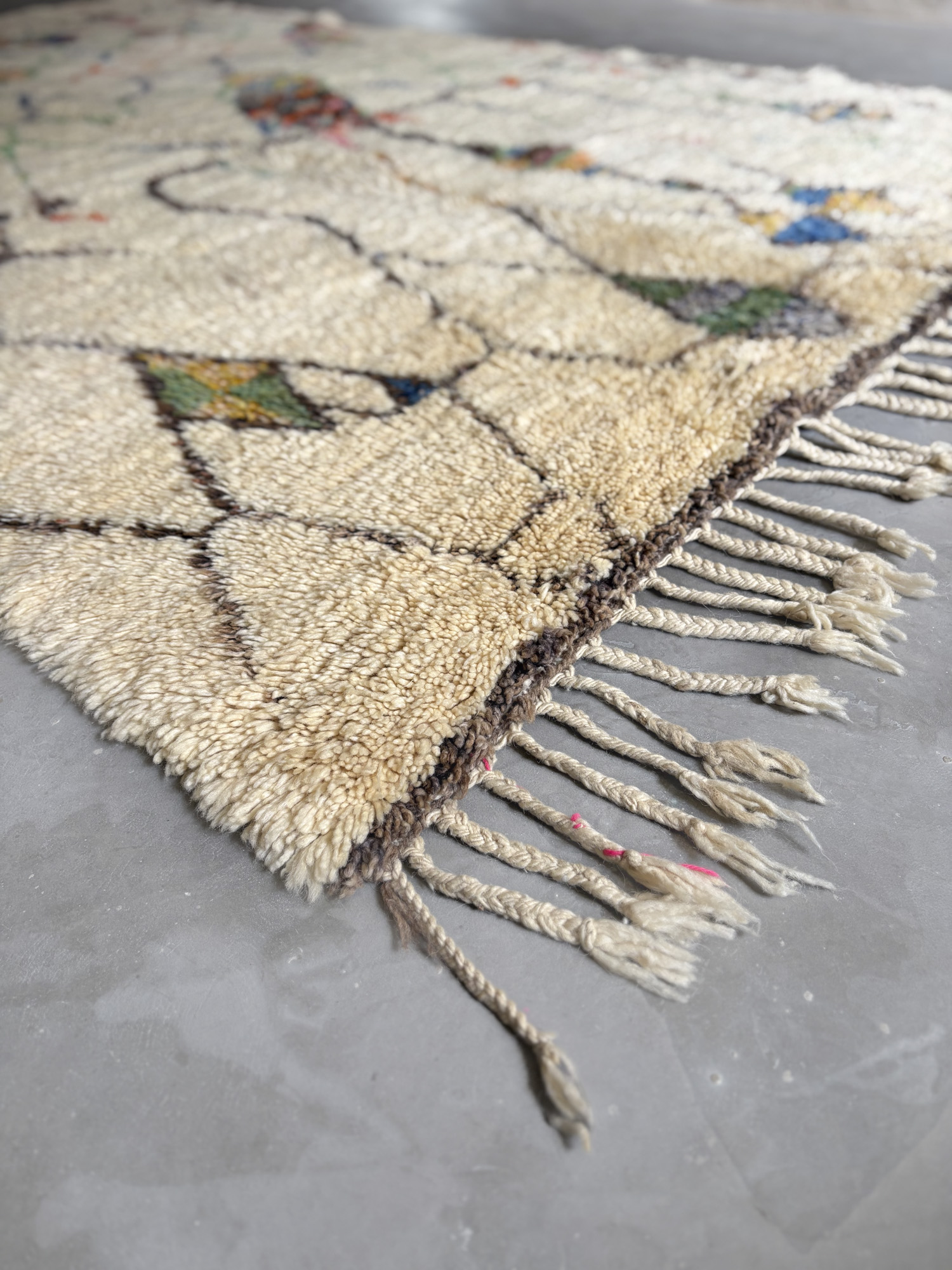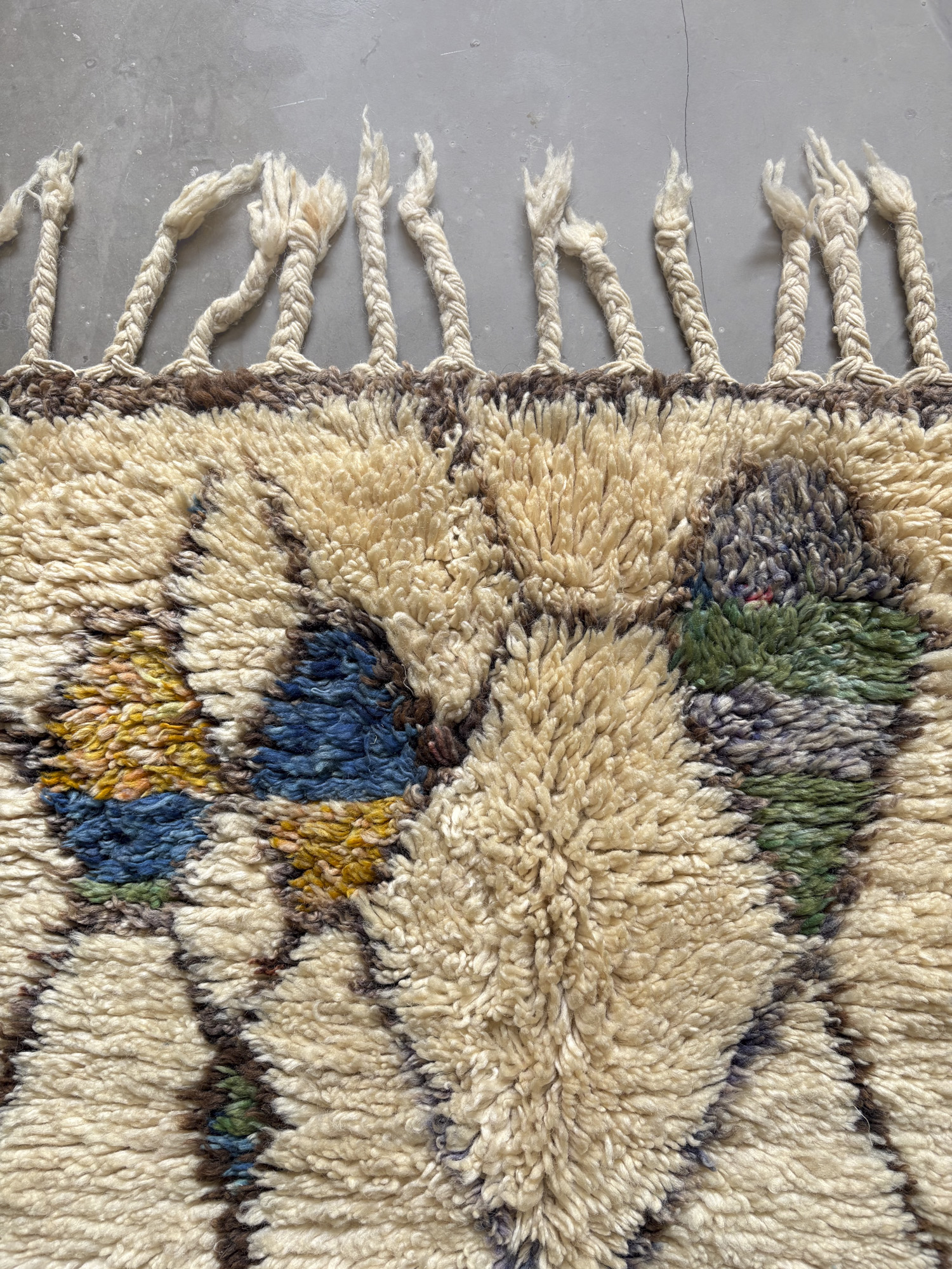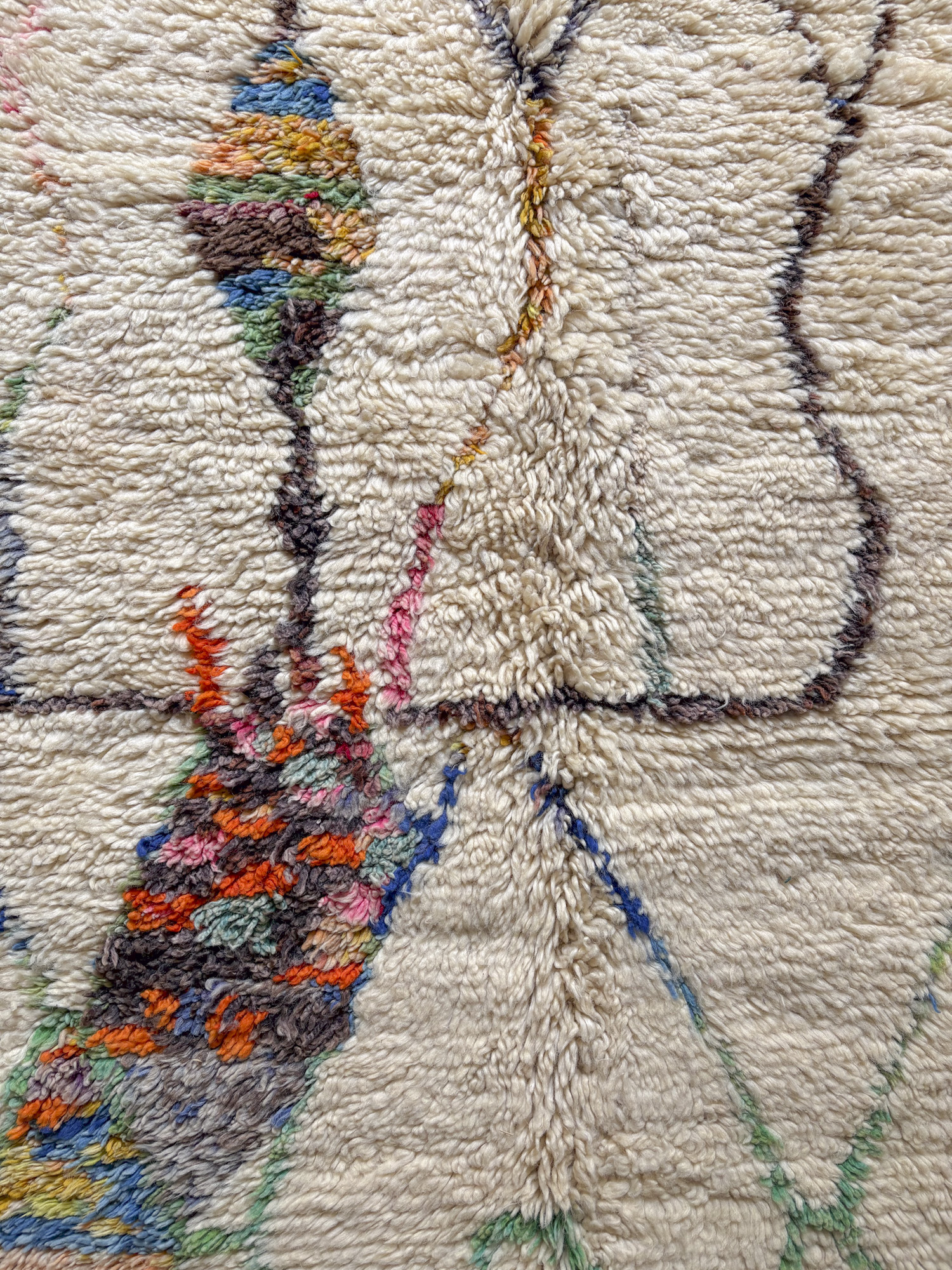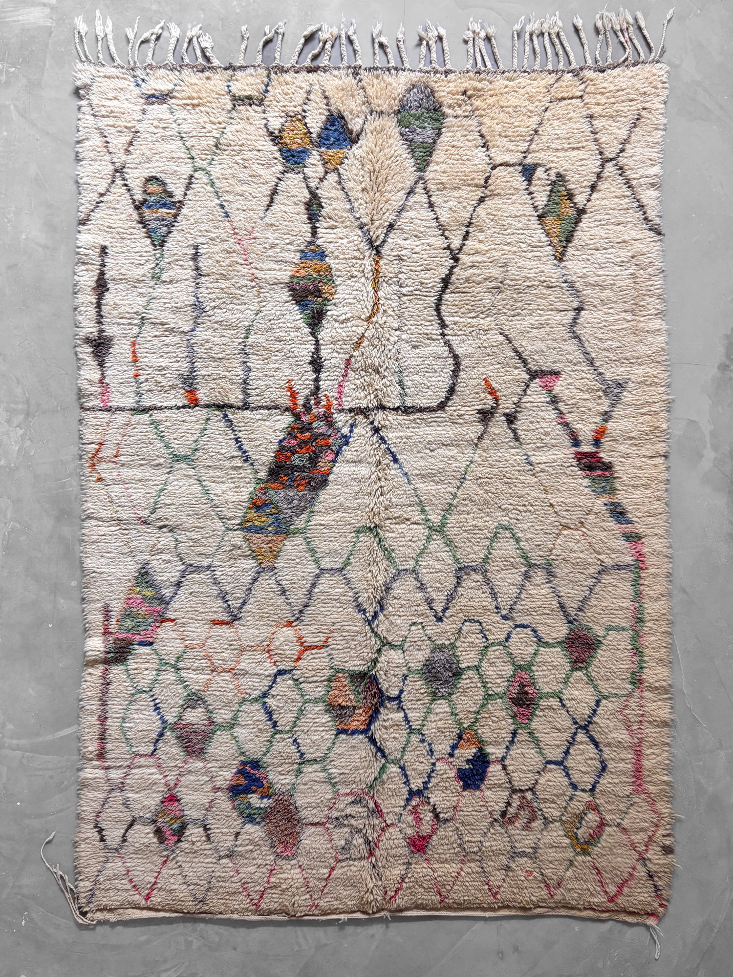 Esta alfombra está hecha a mano y es una pieza vintage, por lo que puede presentar irregularidades propias de su elaboración y del paso del tiempo. Las variaciones en el tejido, el grosor de la fibra o el color forman parte de su naturaleza artesanal y no deben considerarse defectos.