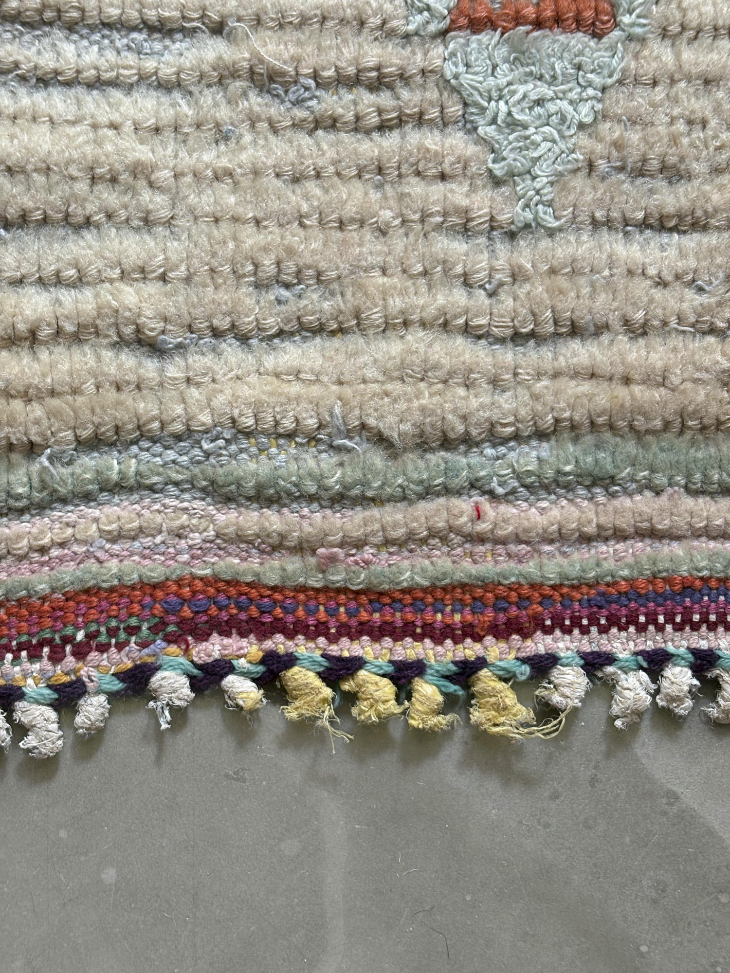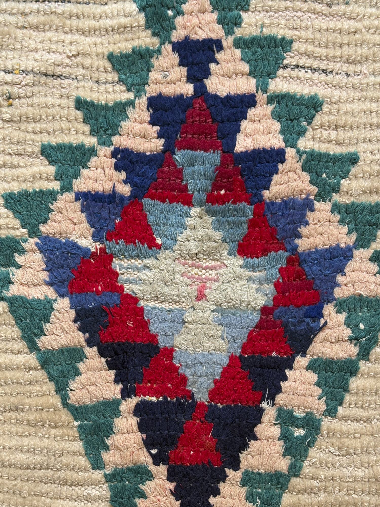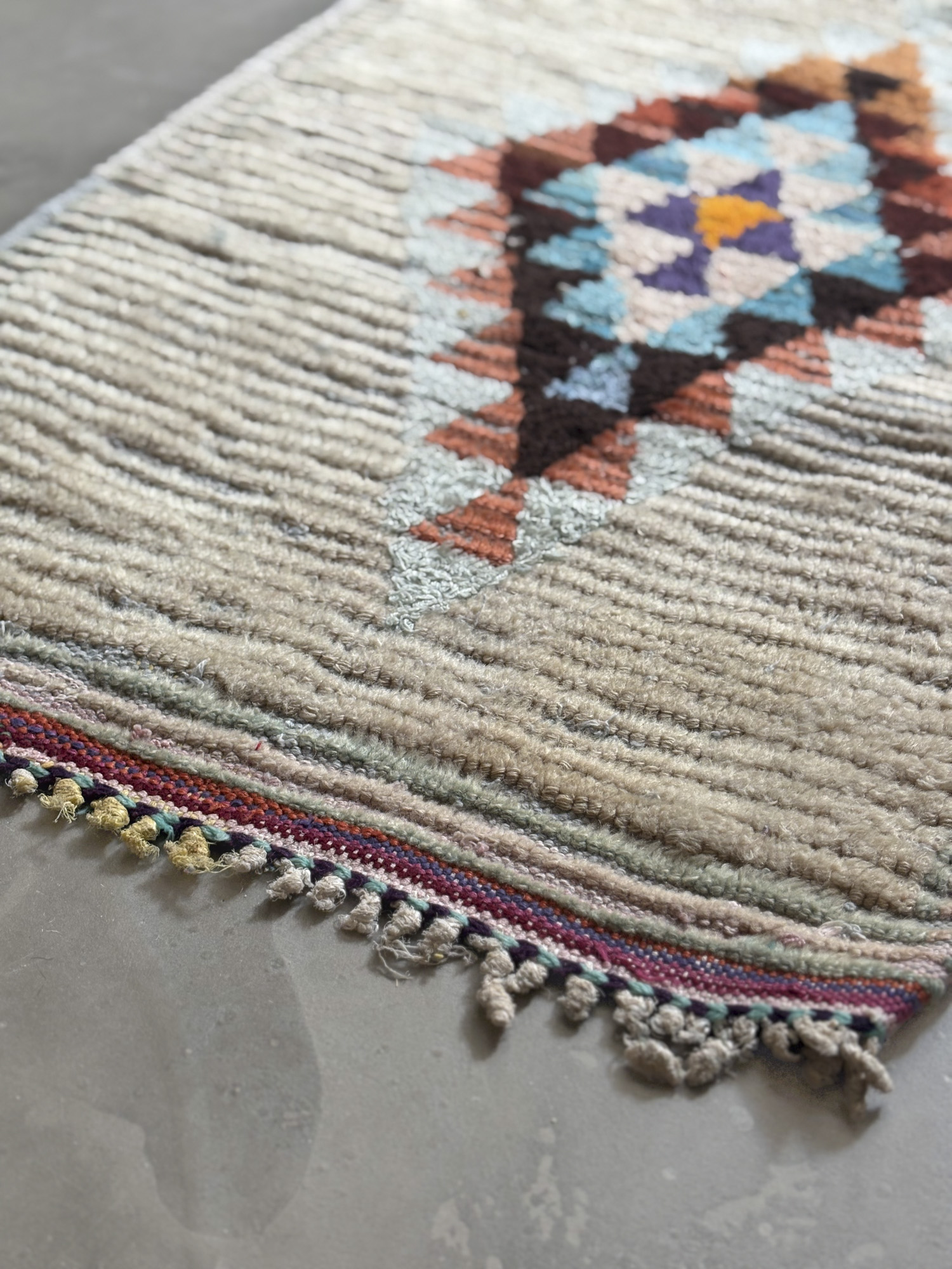 Esta alfombra está hecha a mano y es una pieza vintage, por lo que puede presentar irregularidades propias de su elaboración y del paso del tiempo. Las variaciones en el tejido, el grosor de la fibra o el color forman parte de su naturaleza artesanal y no deben considerarse defectos.