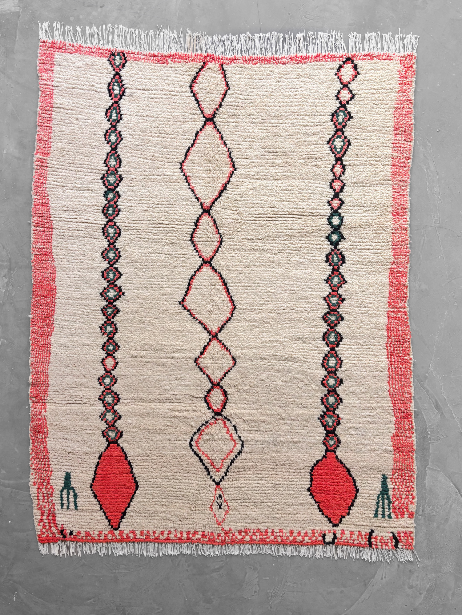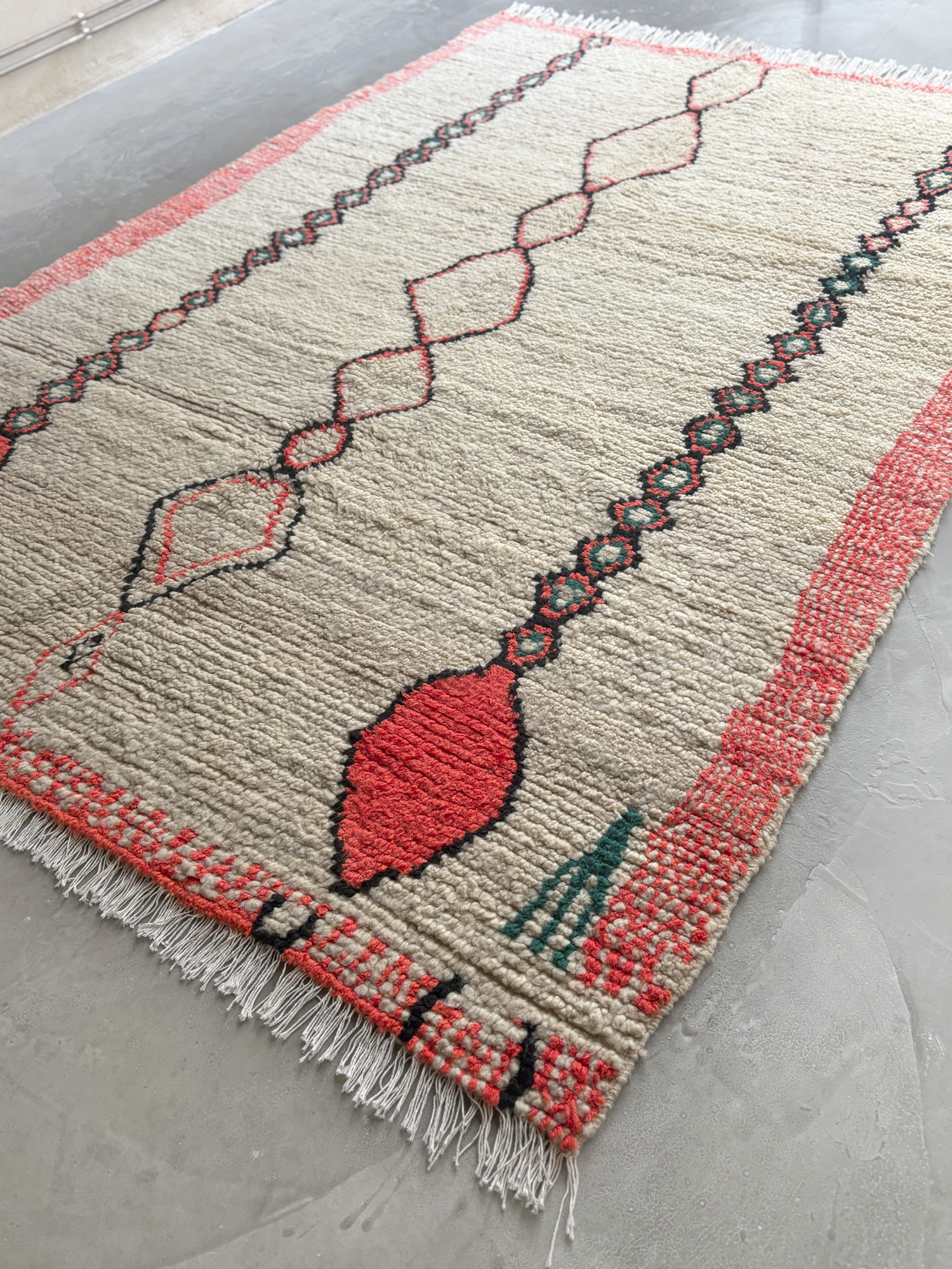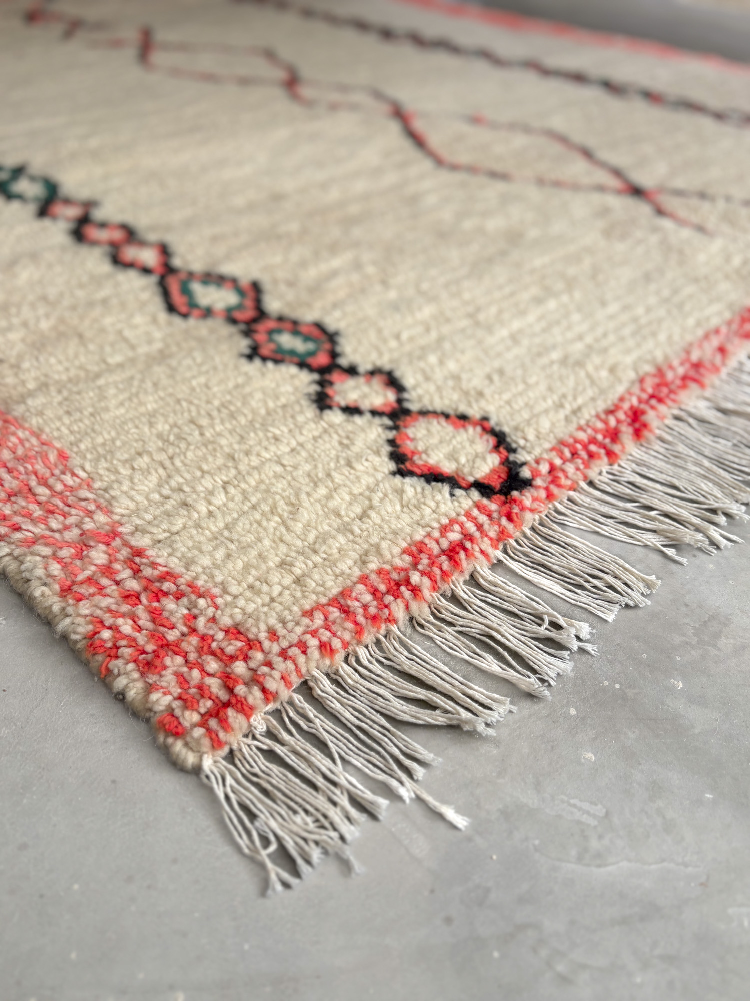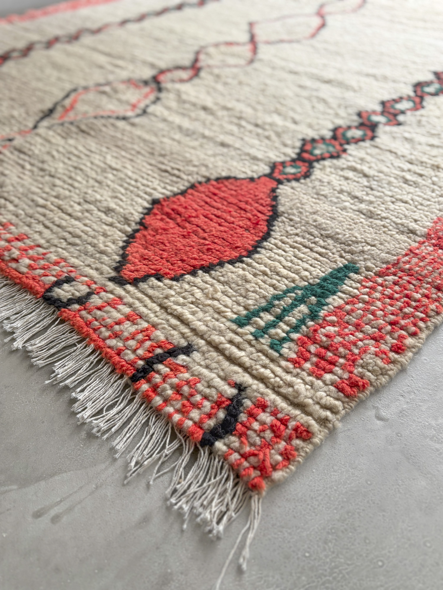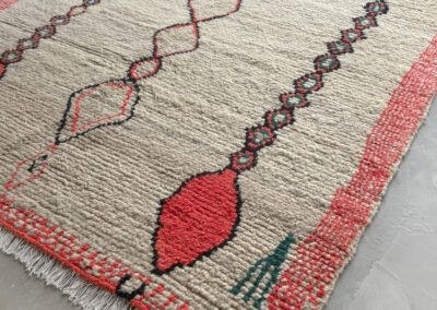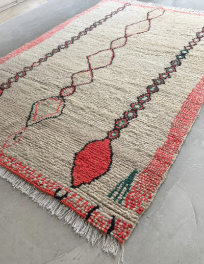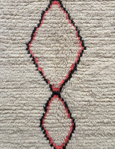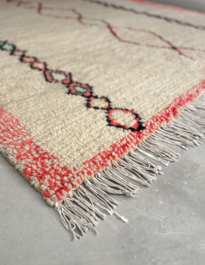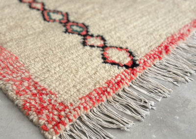Esta pieza está tejida a mano por mujeres artesanas amazigh utilizando técnicas tradicionales y materiales naturales como lana, algodón y otras fibras locales.