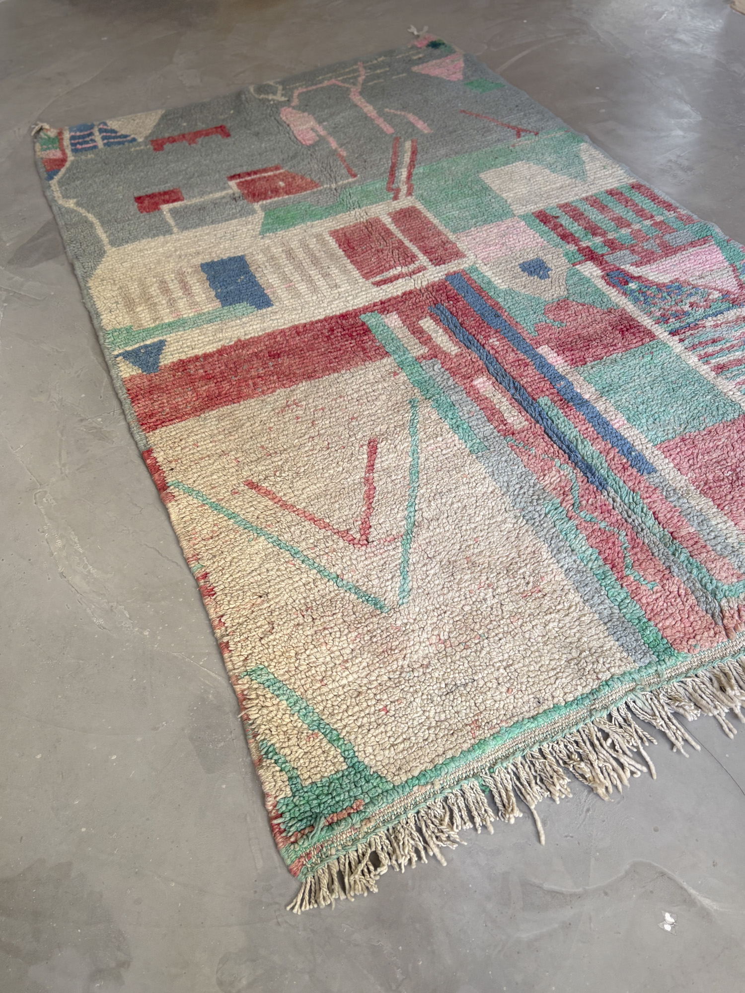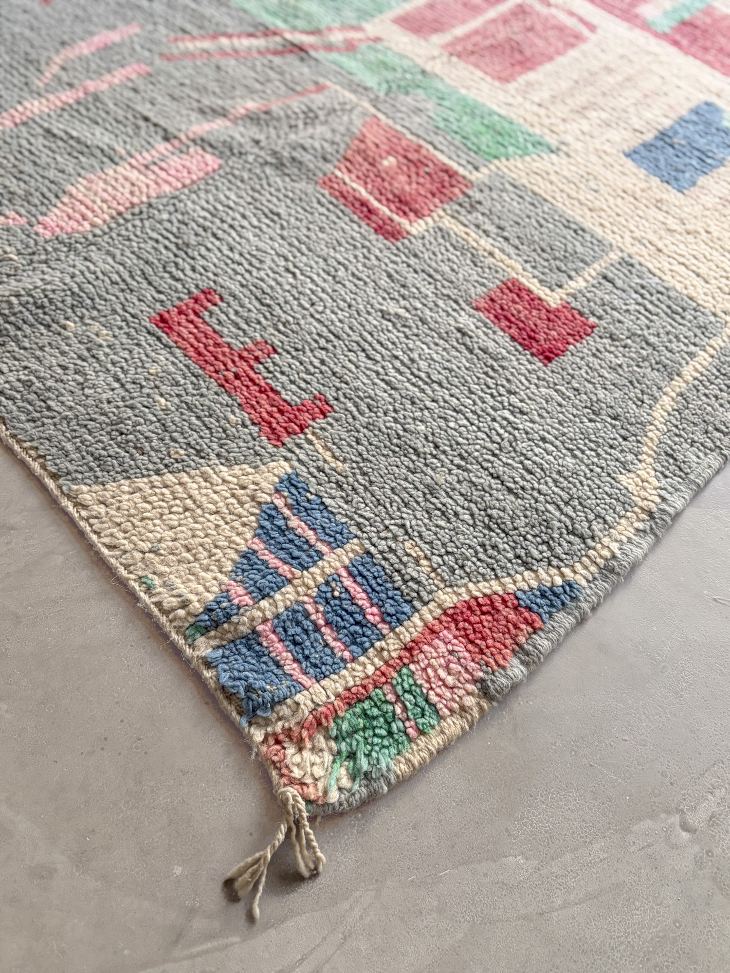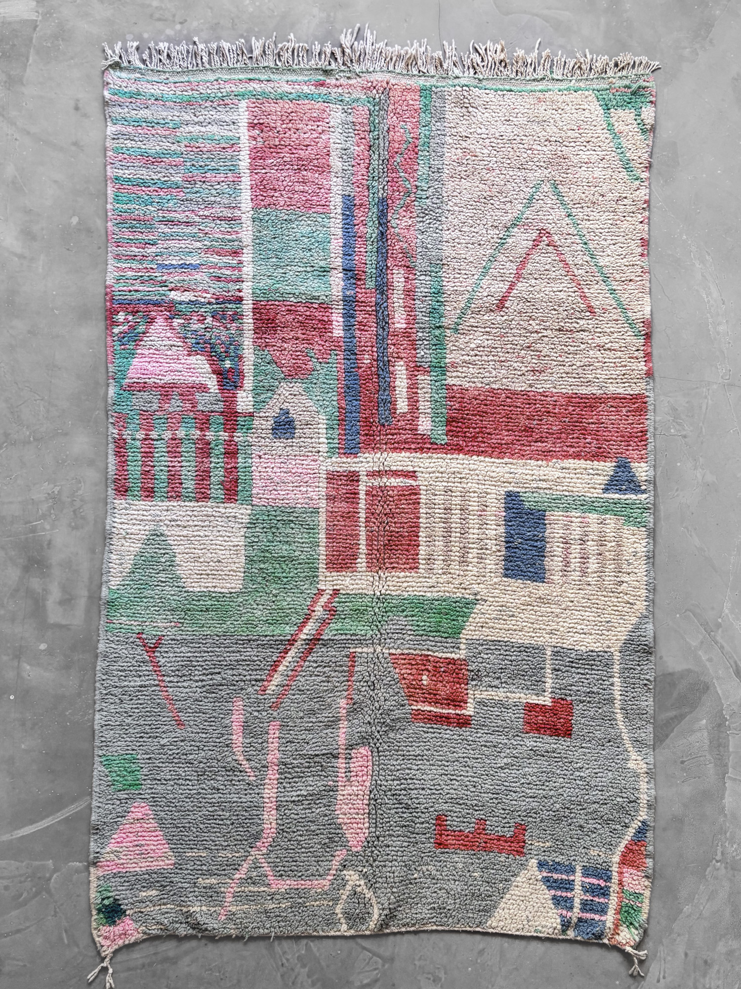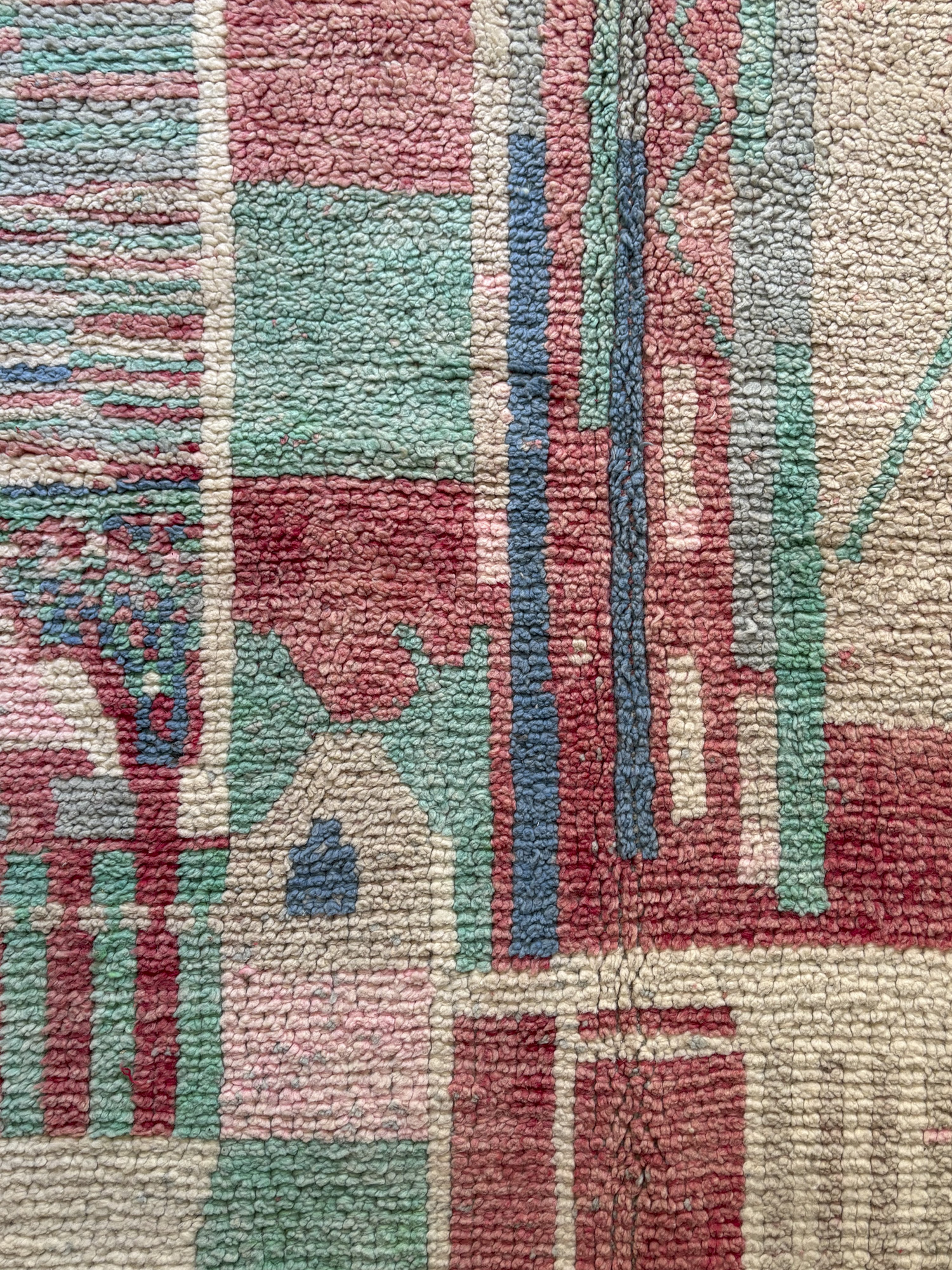 Esta pieza está tejida a mano por mujeres artesanas amazigh utilizando técnicas tradicionales y materiales naturales como lana, algodón y otras fibras locales.