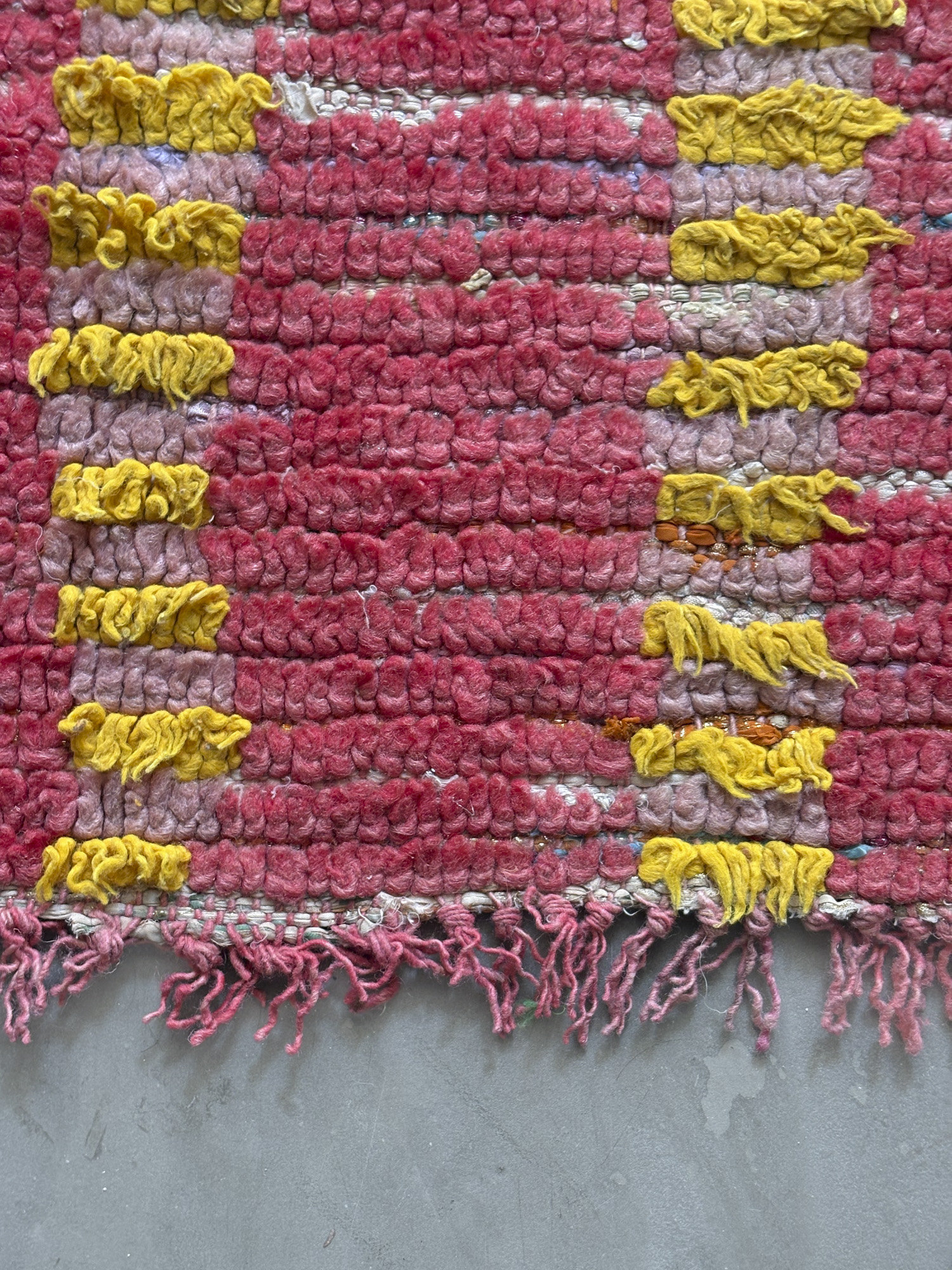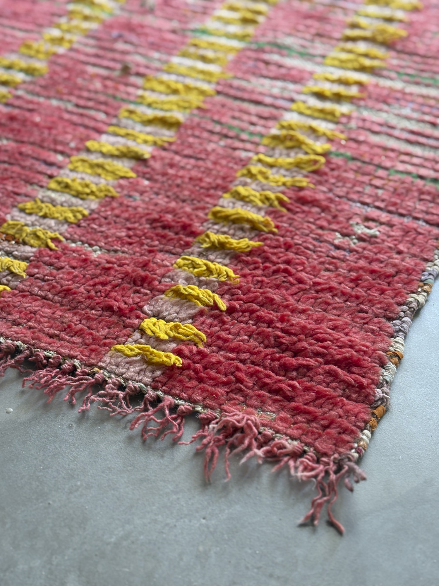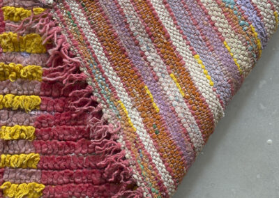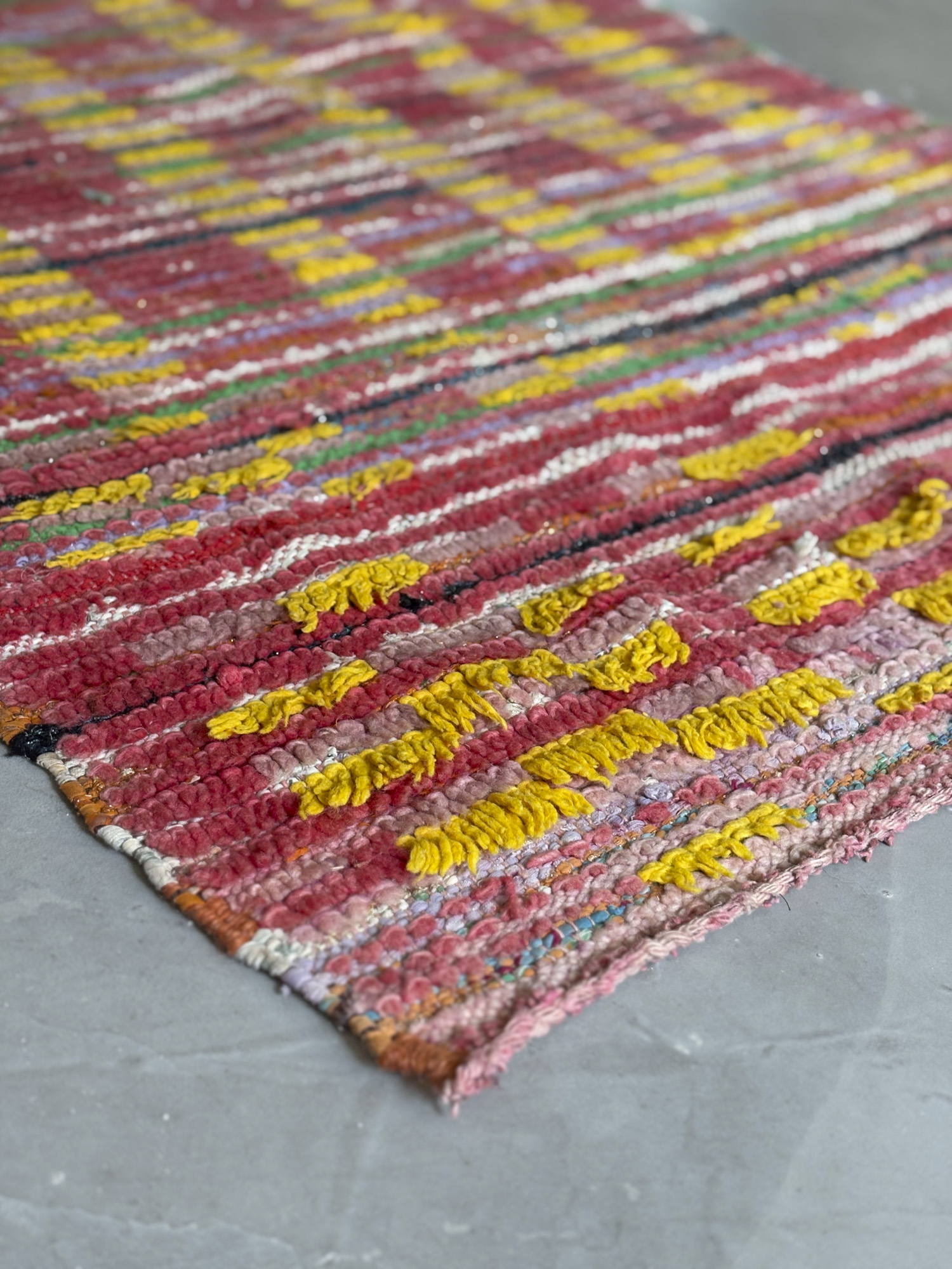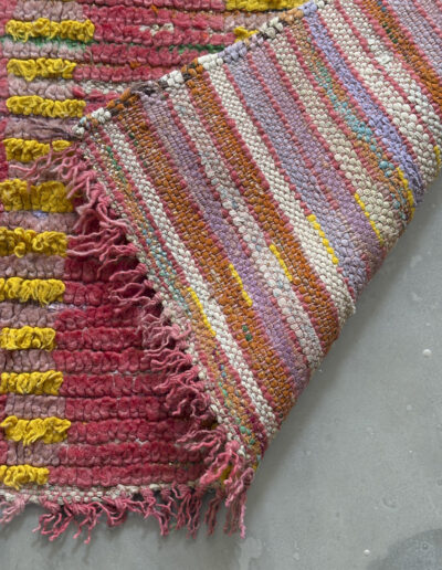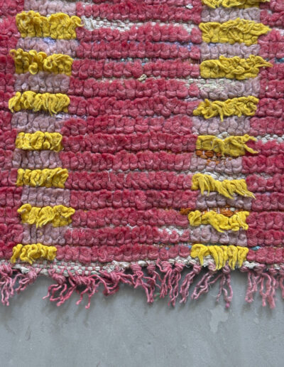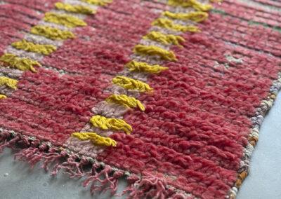 Alfombra boucherouite vintage hecha a mano en tonos rojos y amarillos. Una pieza con textura, color y carácter, especialmente adecuada para zonas de paso, cocinas, entradas o junto a la cama. Puede presentar variaciones en tejido, grosor, color o leves signos de uso propios de su naturaleza artesanal y vintage. Su materialidad la hace especialmente adecuada para zonas de uso cotidiano como cocinas o espacios de tránsito.