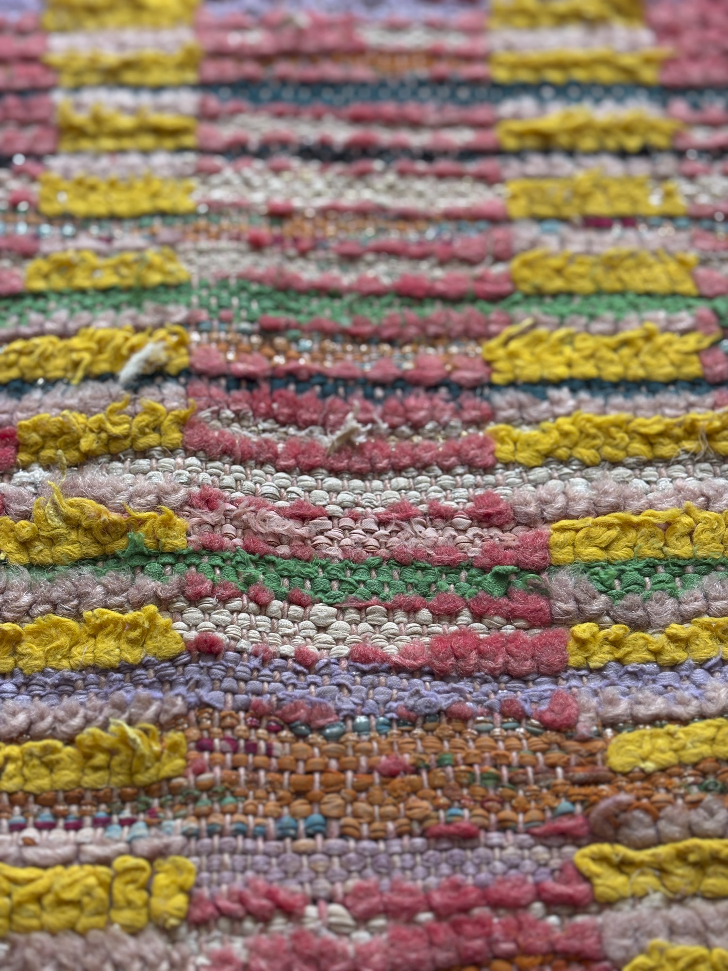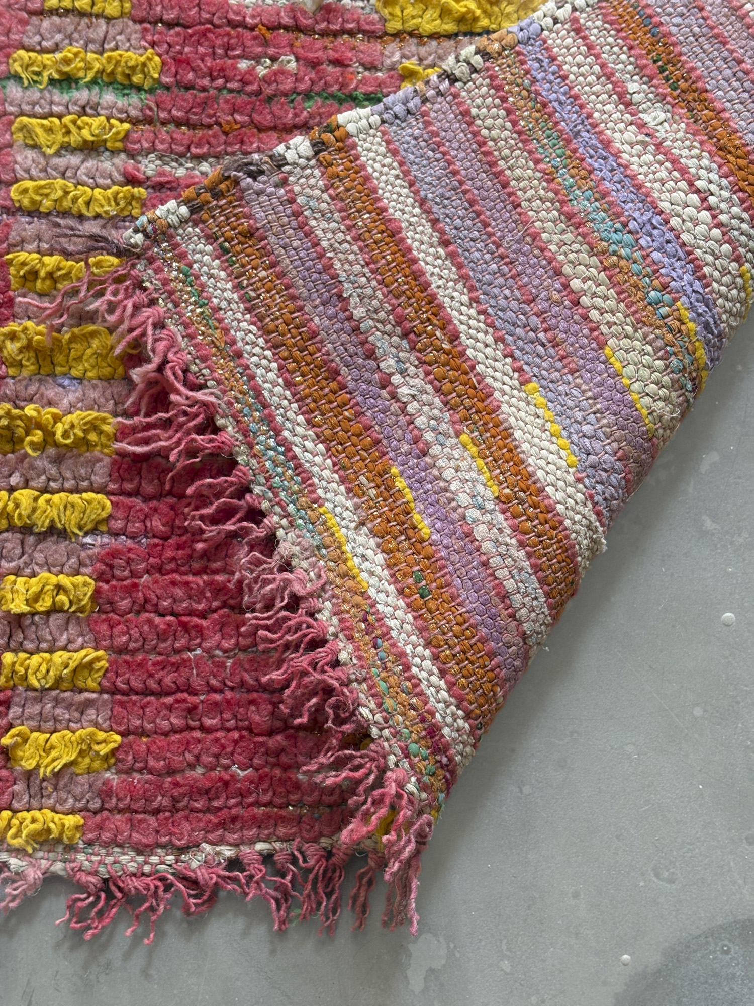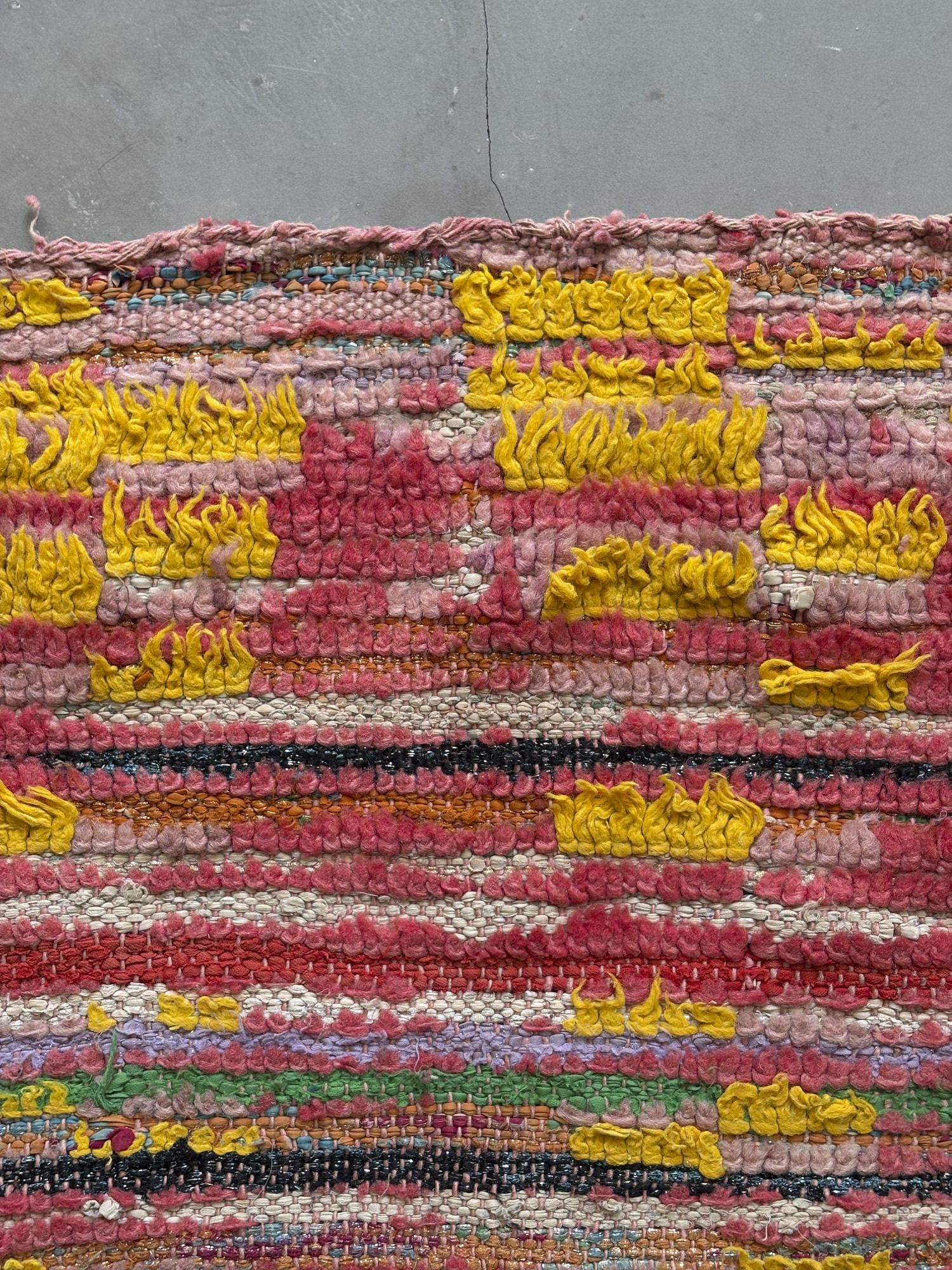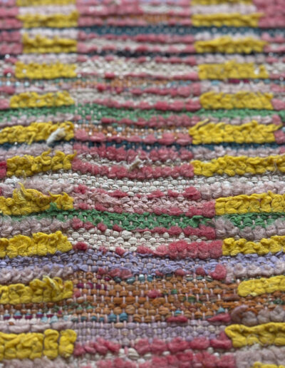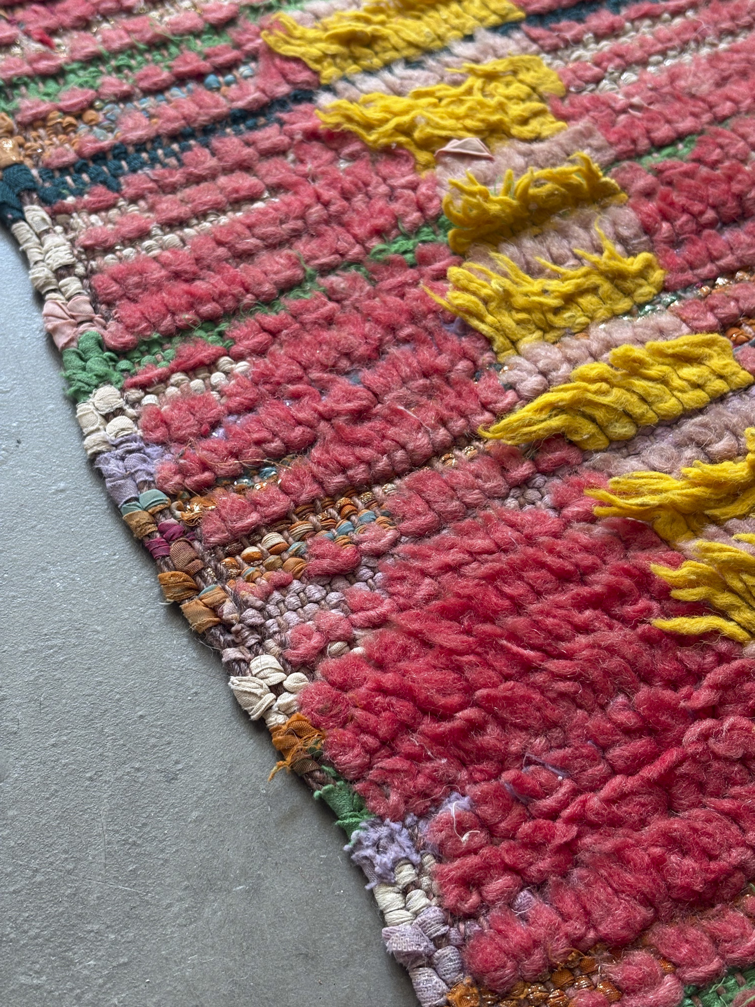 Alfombra boucherouite vintage hecha a mano en tonos rojos y amarillos. Una pieza con textura, color y carácter, especialmente adecuada para zonas de paso, cocinas, entradas o junto a la cama. Puede presentar variaciones en tejido, grosor, color o leves signos de uso propios de su naturaleza artesanal y vintage. Su materialidad la hace especialmente adecuada para zonas de uso cotidiano como cocinas o espacios de tránsito.
