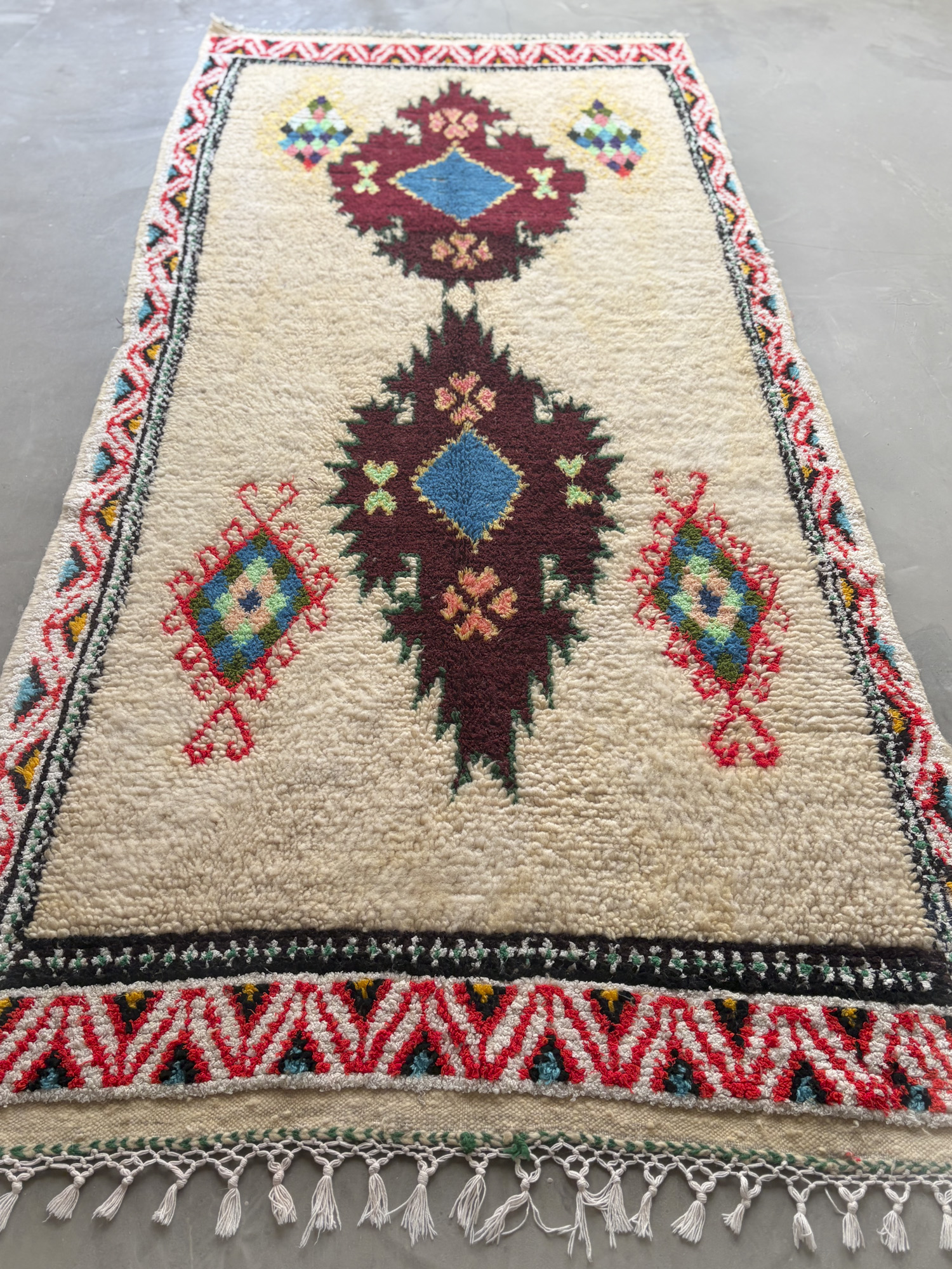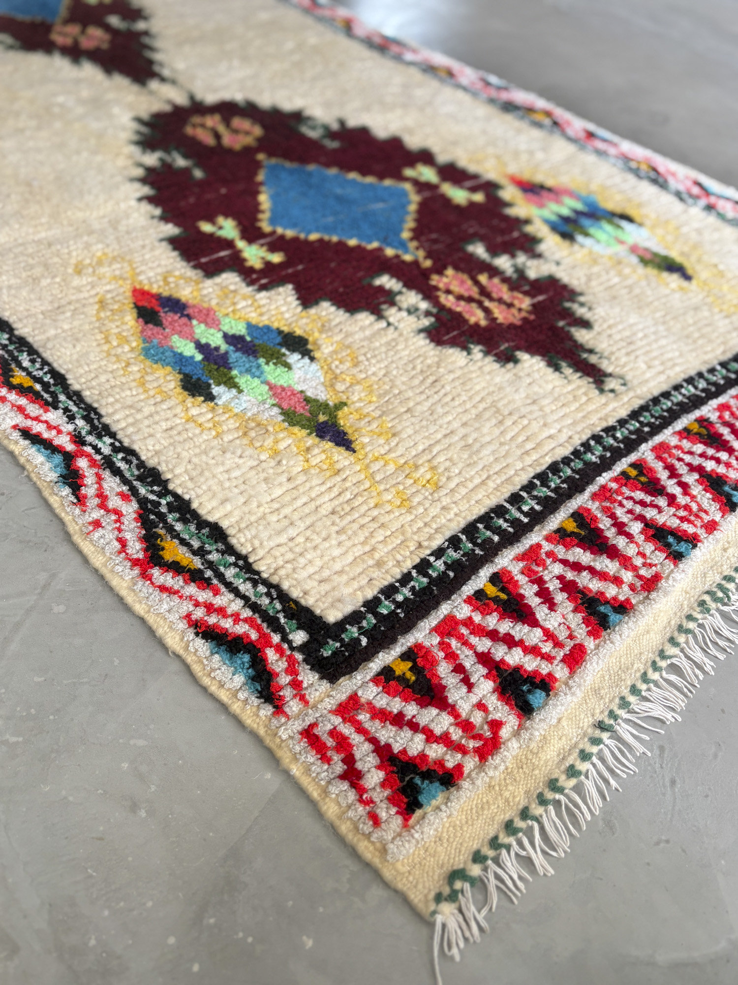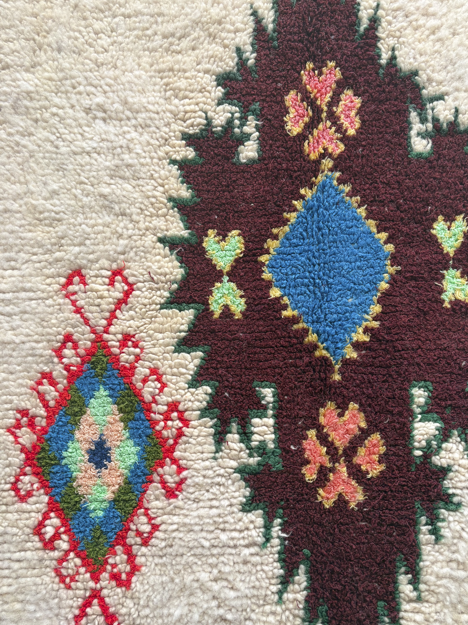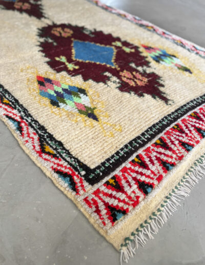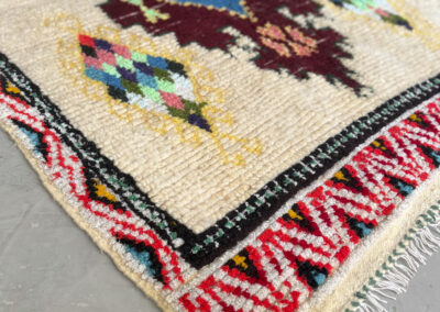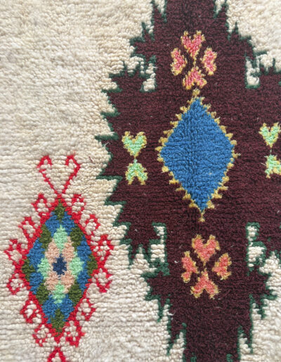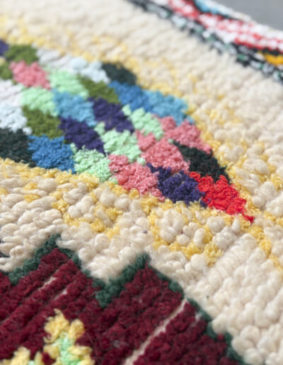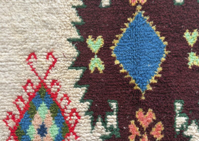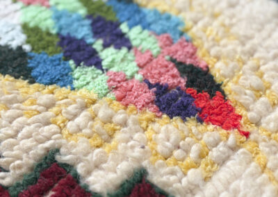 Esta pieza está tejida a mano por mujeres artesanas amazigh utilizando técnicas tradicionales y materiales naturales como lana, algodón y otras fibras locales.