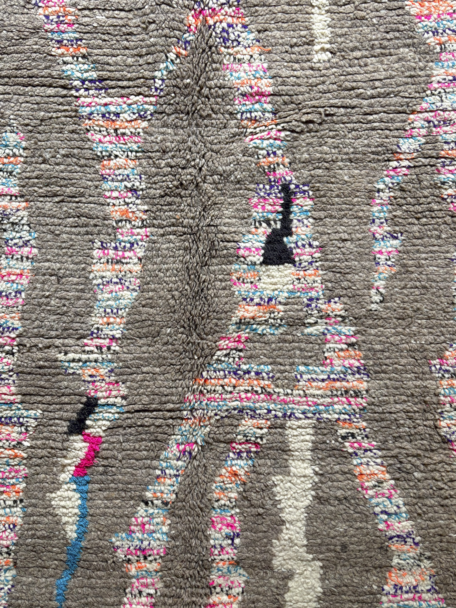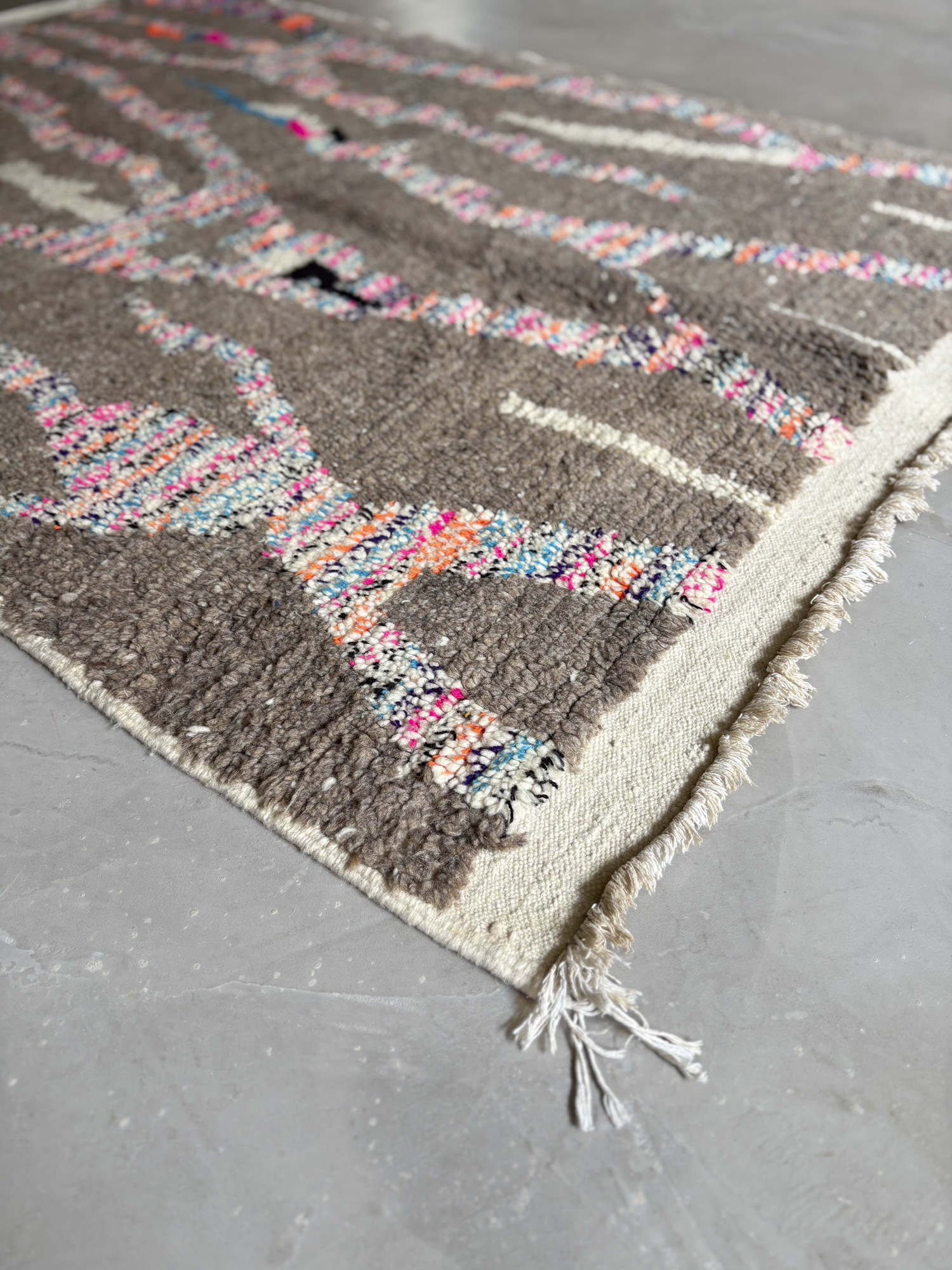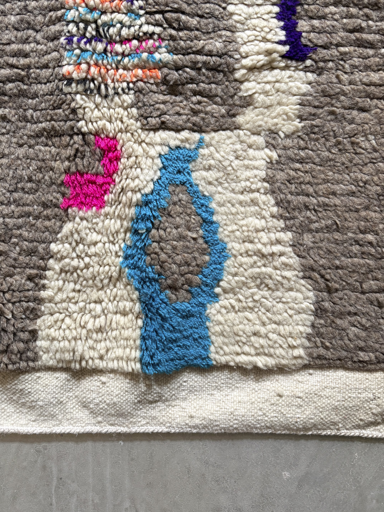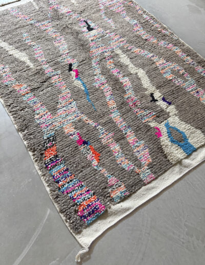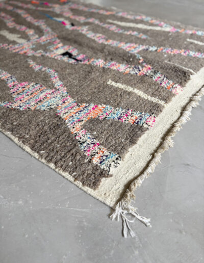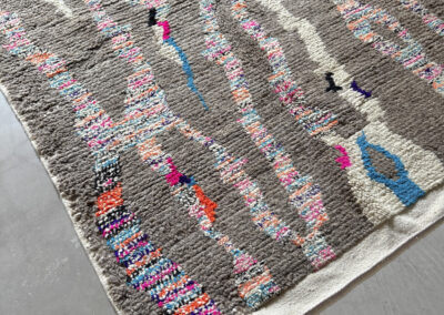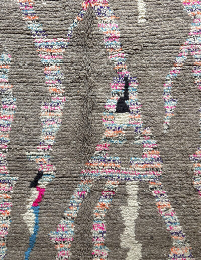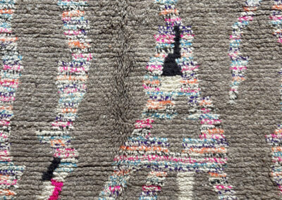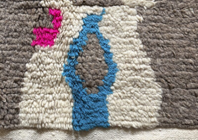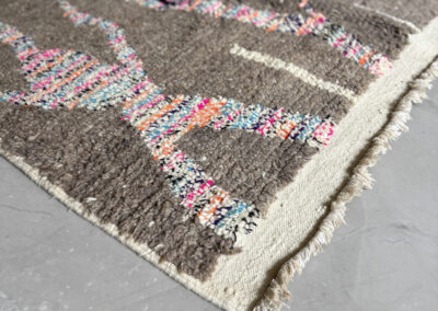 Esta alfombra forma parte de nuestra selección de alfombras de elaboración contemporánea, piezas tejidas recientemente por artesanas amazigh siguiendo técnicas tradicionales. En este caso, la lana procede de alfombras vintage que han sido desmontadas y reutilizadas para dar lugar a un nuevo tejido.