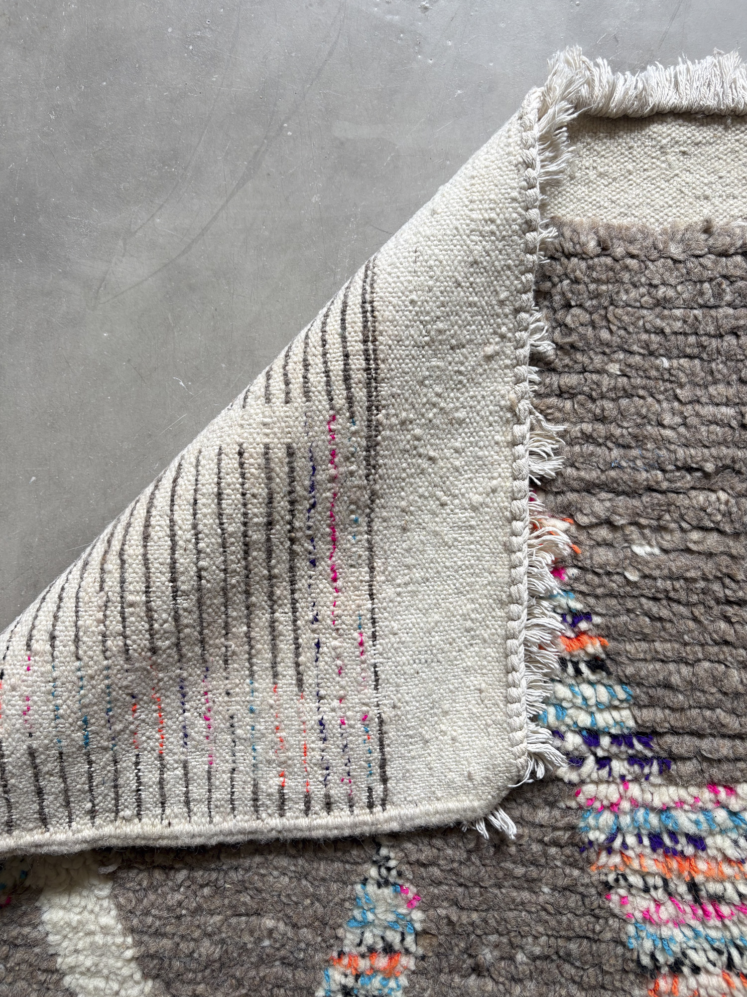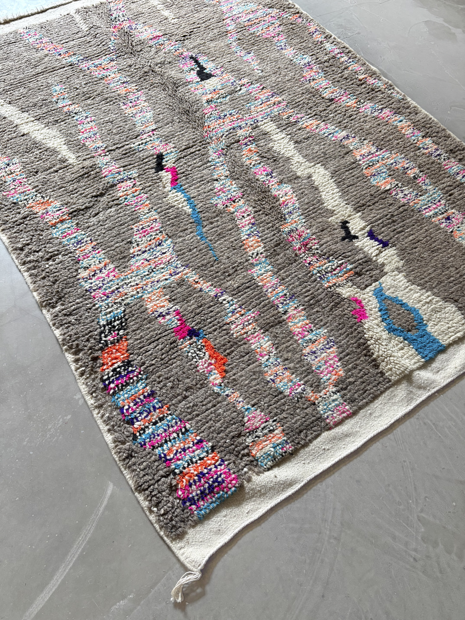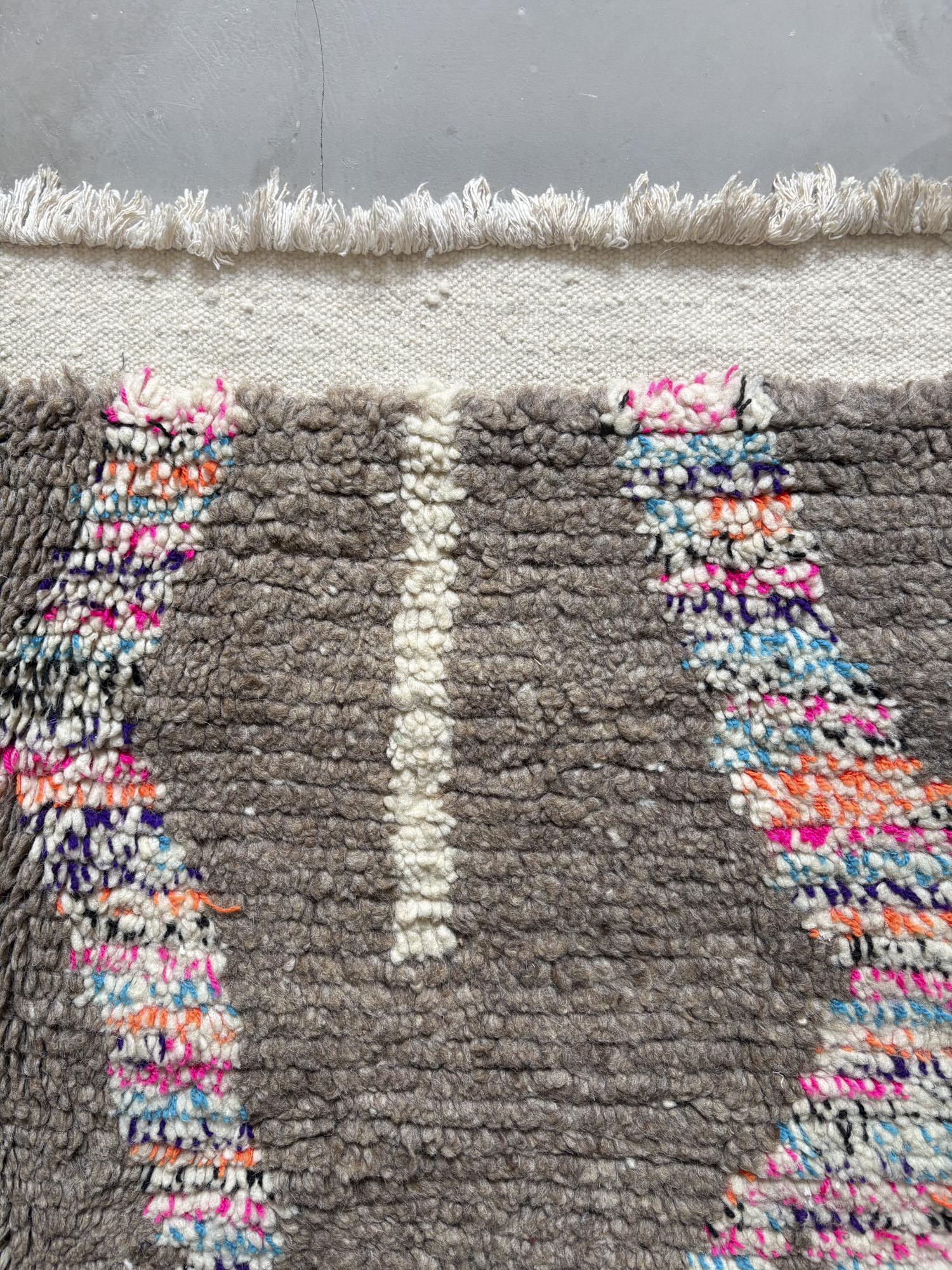 Esta alfombra forma parte de nuestra selección de alfombras de elaboración contemporánea, piezas tejidas recientemente por artesanas amazigh siguiendo técnicas tradicionales. En este caso, la lana procede de alfombras vintage que han sido desmontadas y reutilizadas para dar lugar a un nuevo tejido.